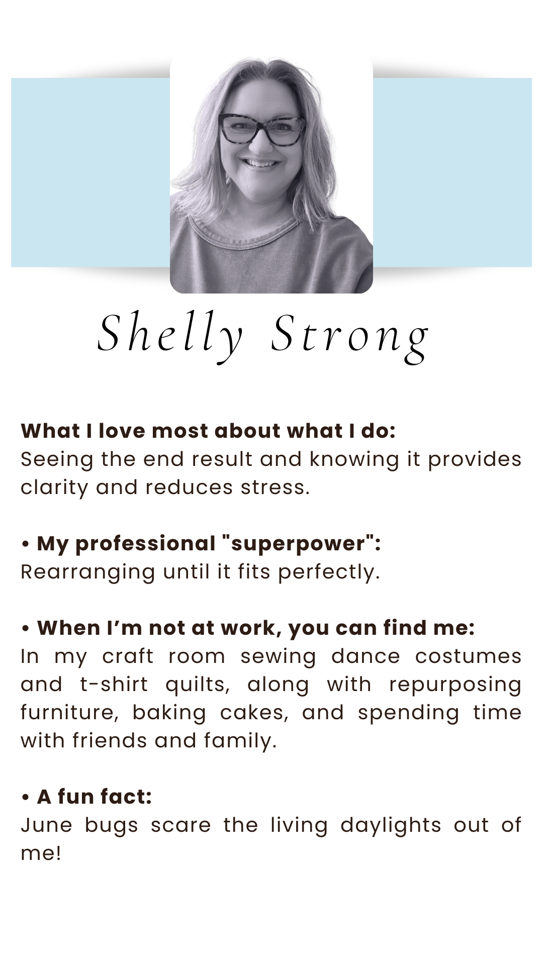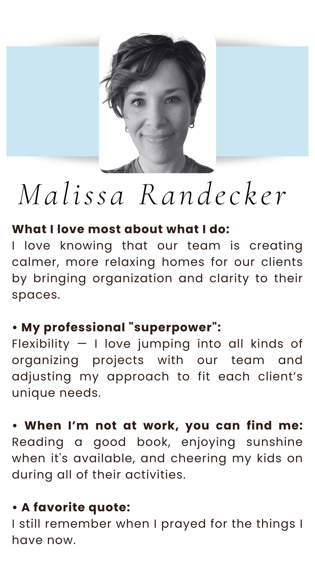 With my background in management and organization, I help you create neat, simple spaces that make life easier. I offer a calm, nonjudgmental approach and provide easy, practical solutions to help you stay organized and stress-free.